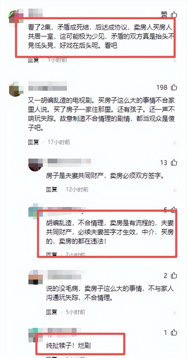 网友吐槽道:“胡编乱造、不合情理,纯在扯犊子,太离谱了。” 还有的表示:“买房子这么大的事情不合理,故意制造不合理的剧情,都把观众当傻子了。”